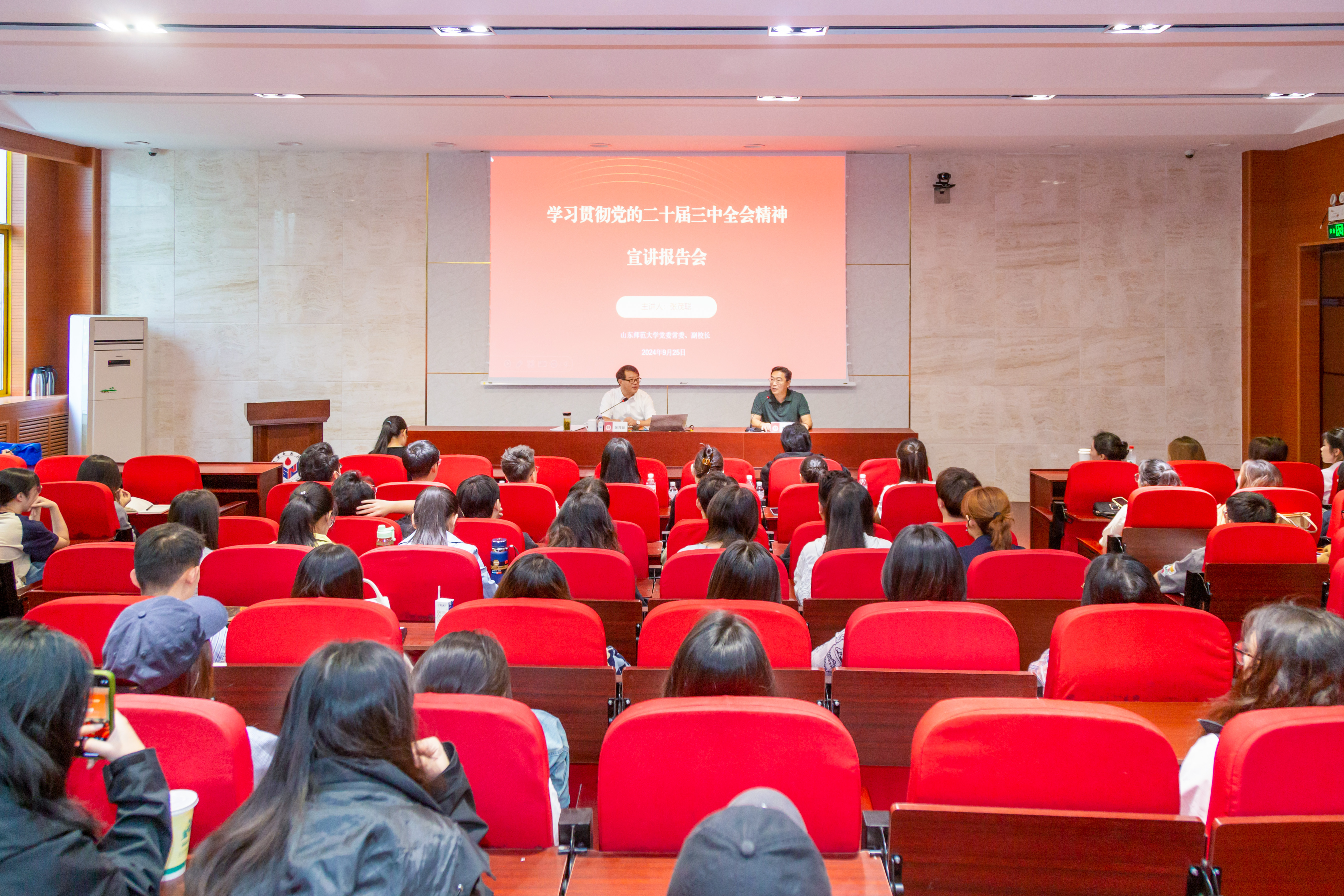 9月25日,赫尔岑国际艺术学院学习贯彻党的二十届三中全会精神宣讲报告会于学校千佛山校区3153报告厅顺利举行。本次报告会由山东师范大学党委常委、副校长张茂聪主讲,学院直属党支部书记李华臣主持,学院部分教职工以及全体研究生到会学习。