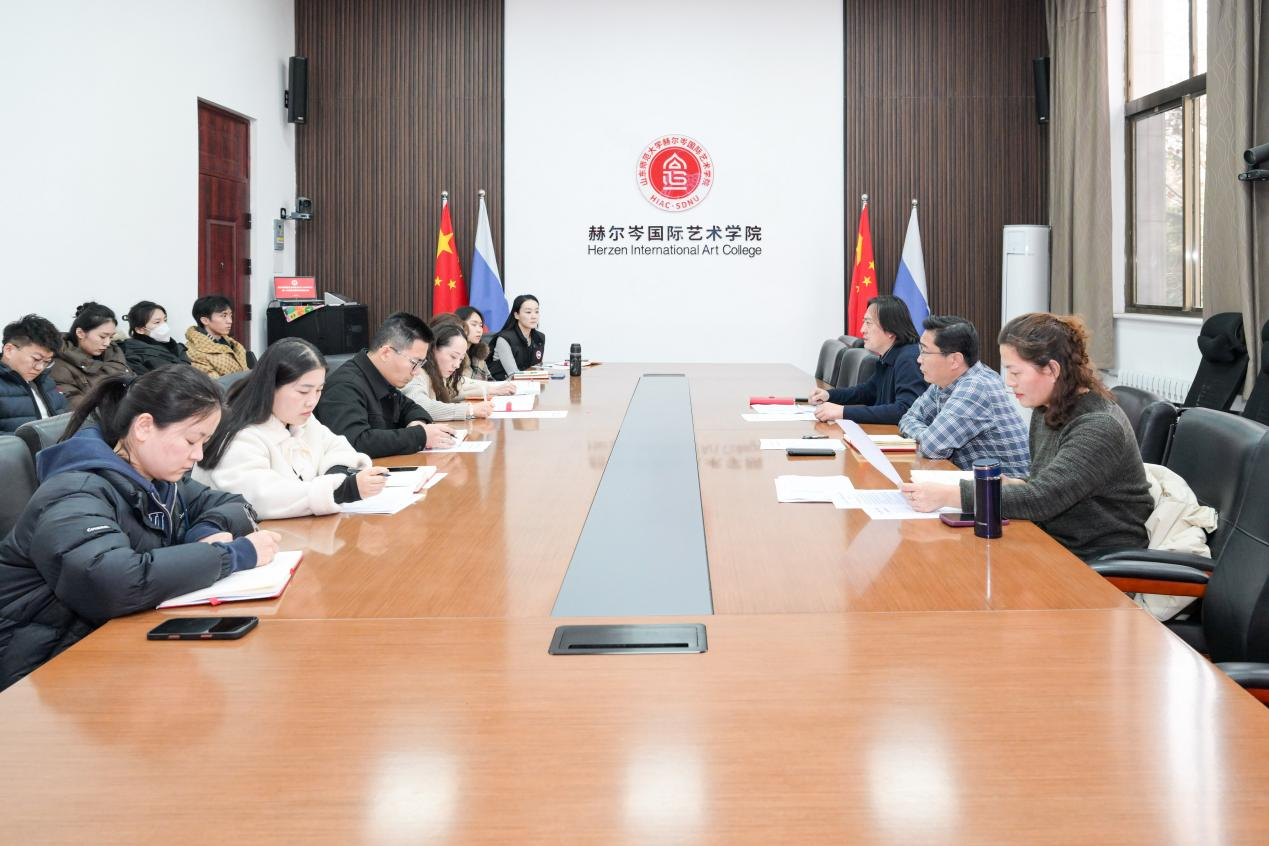 李华臣对本学期各专业教师在教学工作中取得的成效予以充分肯定,强调教学是学院发展的生命线。他指出,教师团队要持续强化教书育人的责任心,将价值引领融入教学全过程,同时,要增强问题意识,及时发现并解决教学中的实际问题,不断提升自身能力,希望大家在教研过程中紧扣国际化办学需要,积极探索中俄艺术教育合作人才培养新路径,培育具有国际视野与扎实素养的艺术人才。刘东峰逐一听取并回应了各系部中存在的问题,他就教学工作提出三方面要求:一是要聚焦教学过程问题,通过多元化途径增强教学质量,建立常态化中俄教学研讨机制;二是要把握期末考试、毕业论文、俄语教学等关键教学环节与内容,构建辅导员、俄方教师多方沟通协作育人合力,切实保障各项教学工作计划要求扎实推进;三是各专业要策划彰显中外合作办学特色的系列教学成果展示活动,提前筹备学院首届毕业生毕业晚会。宋丽萍对本学期教学重点工作进行总结部署,着重明确期末考试命题规范要求,保障学期末各项教学工作平稳有序推进;针对首届毕业生工作,要求指导教师严把质量关,从选题、指导到评审答辩各环节全程把控,确保毕业论文工作有序推进、高质量完成。各专业负责人围绕课程实施、学生学情、教学成效及存在问题等方面内容,依次汇报了本学期音乐、美术、舞蹈与俄语的教学情况。与会人员就各专业在教学过程中的实践与探索问题,展开深入交流与研讨。本次教学专题研讨会总结了经验,明确了方向,凝聚了共识。学院将继续围绕教学质量提升与国际化教学实践的核心议题,常态化、机制化地开展教学研讨,推动中俄联合培养方案全面落实,助力学院人才培养工作再上新台阶。