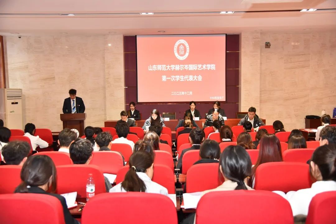 12月19日,赫尔岑国际艺术学院在千佛山校区教学三楼3153报告厅召开第一次学生代表大会。学院直属党支部副书记吴晓玲,学院团委书记、学工办主任许晓飞,学院辅导员蔡耀锋、孙璐茜,校学生会执行主席栾亦宸列席会议,55名学生正式代表参加会议。