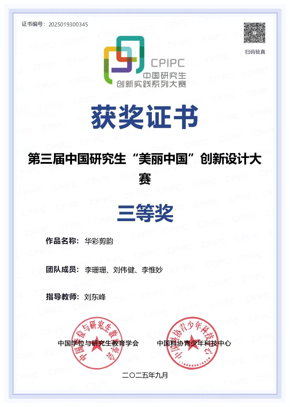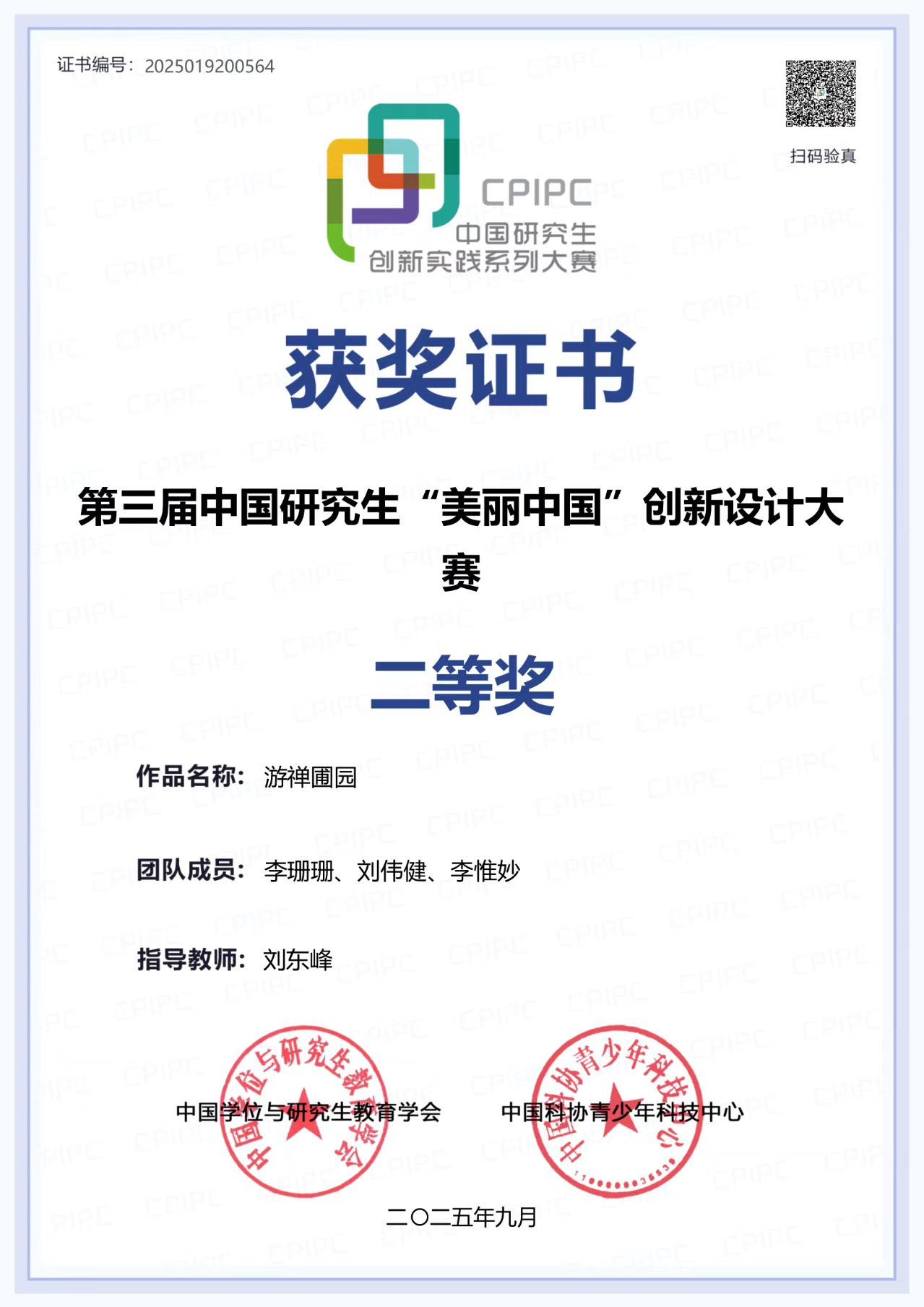 近日,第三届中国研究生“美丽中国”创新设计大赛奖项公布,我院学生作品展获国家级一等奖1项、二等奖1项、三等奖3项。