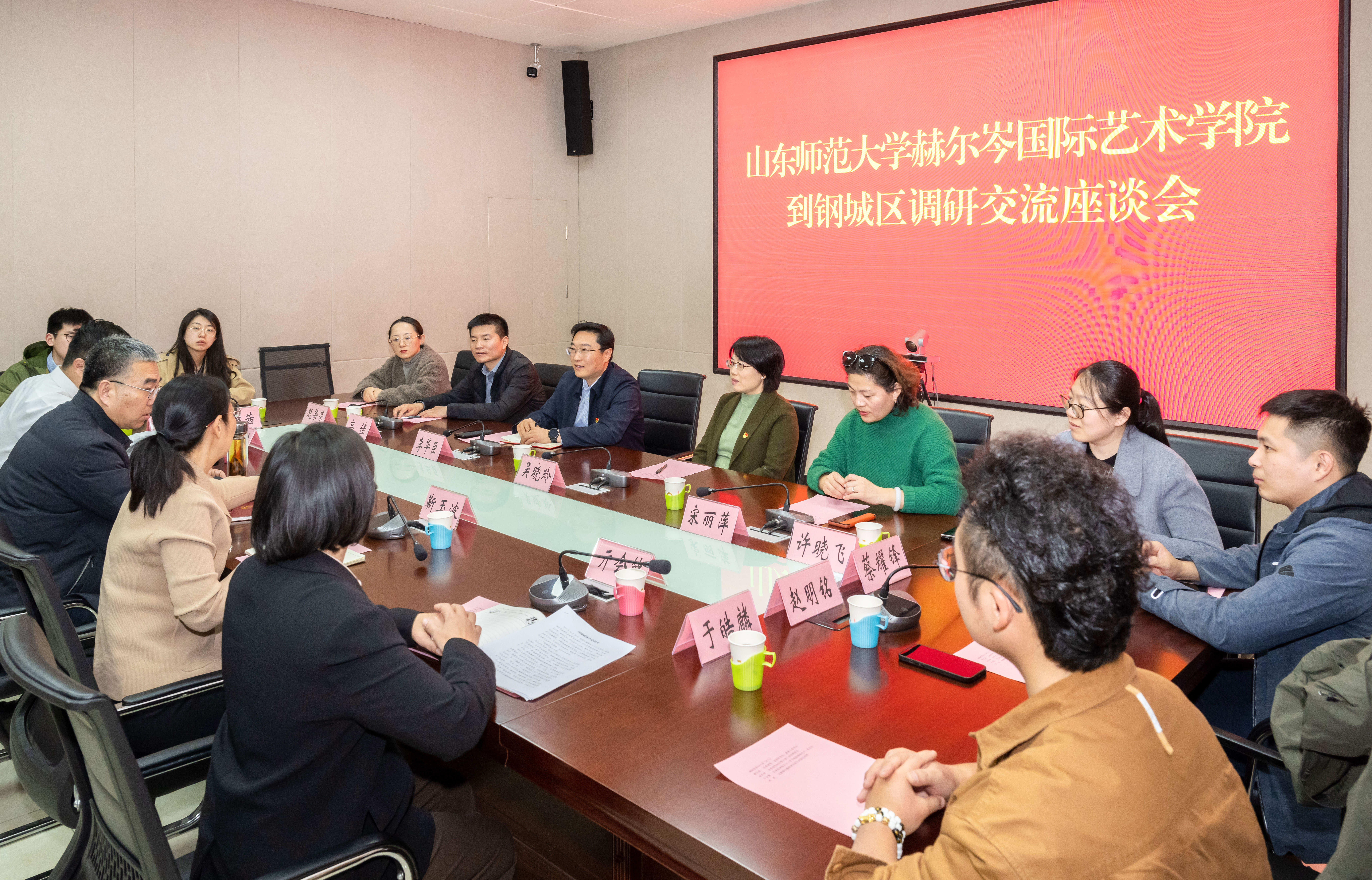 座谈中,靳玉波详细介绍了钢城区的文化建设、钢城融媒传播集团建设运营管理、媒体平台建设等情况。李华臣对钢城区宣传部的热情接待表示感谢,介绍了学校及学院的基本情况,重点结合学院特色从服务地方、产教融合、项目开发、基地建设等方面提出了意见和建议。随后,双方就社会实践基地建设、大学生实习就业、媒介资源共享等方面进行了深入交流,双方一致认为,高校与地方媒体应当加强合作,将理论知识与专业技能应用到社会实践服务当中。下一步学院将结合钢城区的实际需求,利用学院国际化办学特色及多专业特点,在志愿者服务、专业实践等方面加强务实落地的合作,共同打造地域文化精品和传播新形态,搭建起实验教学、产教融合平台,创造更多的学生实践机会。同时,将地区传统文化要素带进课堂,激发学生对传统艺术的兴趣。学院将以融媒体中心实践基地设立为契机,开展共建项目规划策划,建立灵活、高效的全方位多领域合作机制,促进校地间的紧密联系,有效提升我院地方教育和建设的服务能力。 双方还在支部共建、基层党建、思政课堂及乡村振兴等方面进行了交流,并达成合作意向。