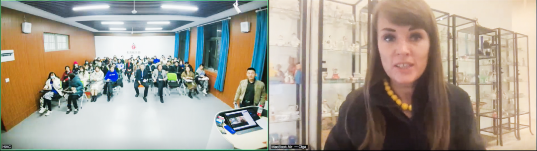 谢尔盖耶夫娜首先介绍了俄罗斯国立师范大学的校史、校徽以及美术教育学院的发展历史,然后从列宁格勒(现圣彼得堡)的著名历史建筑艺术元素入手,分析了列宁格勒在苏联不同历史时期中的艺术形象。她认为,对艺术家而言,列宁格勒是一个文化艺术符号,逐步形成鲜明的“列宁格勒风格”,演化成为20世纪20年代著名的“先锋画派”。她重点介绍了马列维奇与苏叶金合作的至上主义瓷器作品,随后分析了艺术家亚科夫列娃和库巴勒斯克雅合作的以二战题材为主题的瓷瓶作品“列宁格勒的封锁”,歌颂了列宁格勒人民的刚毅与坚强。随着战后生活水平的提高,列宁格勒历史建筑题材的瓷器创作,逐步延展到化妆盒等日常生活器皿,最后延伸到“列宁格勒人”这个主题,他们的生活、他们的姿态都成为了瓷器艺术创作的题材……最后,谢尔盖耶夫娜感谢大家的聆听,欢迎山东师大师生到俄罗斯国立师范大学考察、交流,期待更多的教学与科研合作,进一步巩固和加深两校的沟通和交流。