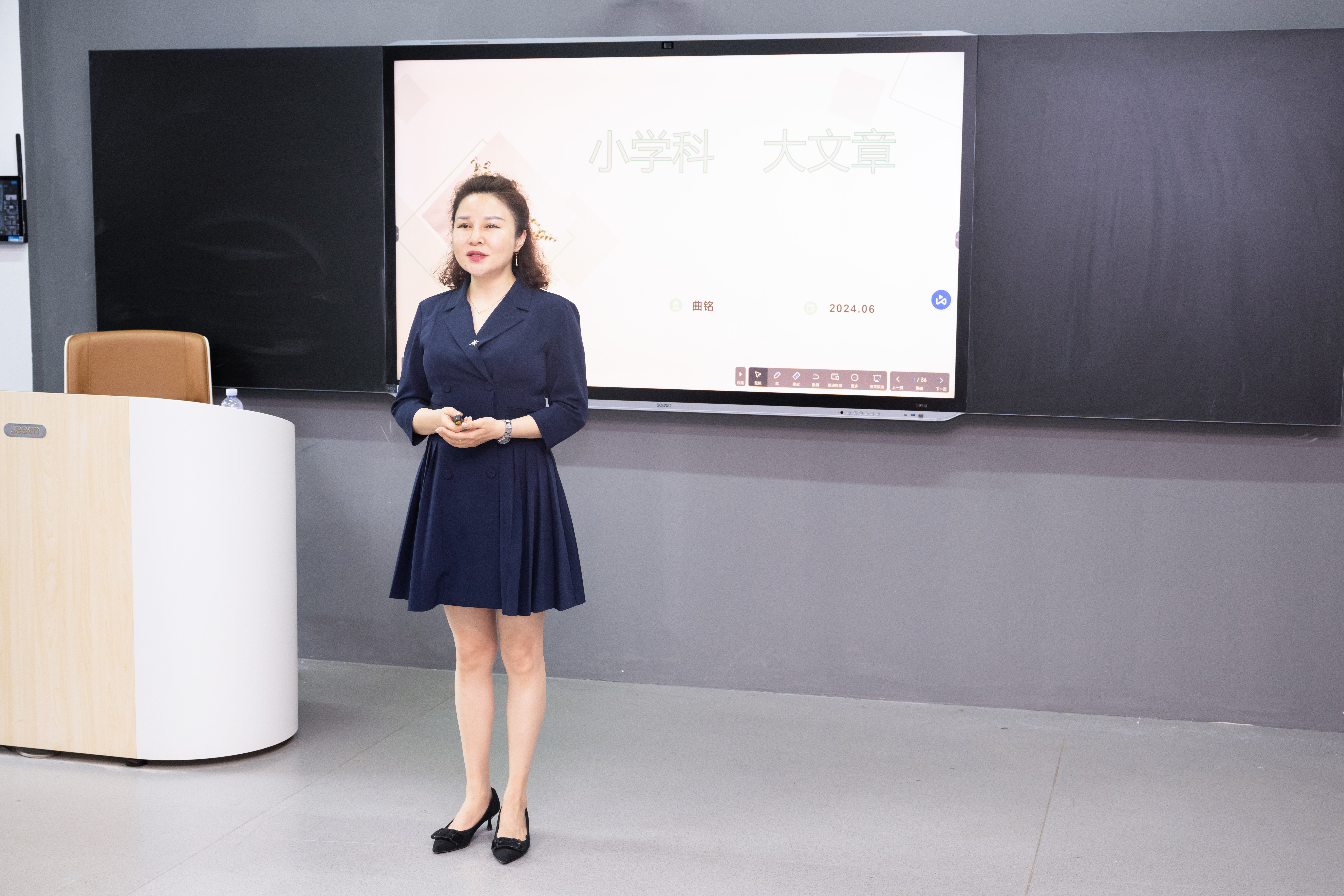 曲铭以自身经历为切入点,以山师附小优秀的音乐教师团队和团队的“ME-WE-ALL工作法”为例,梳理了小学音乐教师、小学音乐课堂的教学现状。曲铭通过案例展示,围绕“教-学-评”主题,充分展示了一线教师如何将多方面的知识、资源整合融入一节音体美课程当中,再通过每一节课程的迭代,潜移默化地培养孩子们的审美感知、艺术表现、创意实践、文化理解能力。最后,曲铭叮嘱同学们要研究义务教育艺术新课标,注重教学所需的专业技能、教学逻辑、教学理念。宋丽萍在总结中对曲铭老师给予了高度的赞扬和诚挚的感谢。她表示,硕士研究生阶段学习输入和教学输出之间需要曲铭老师这样有着丰富教学经验的一线教学能手传经送宝,才能有的放矢、脚踏实地地探索和努力;学院将搭建多元化的实践交流平台,为大家提供学习和锻炼的机会,提升同学们的专业技能和综合素养。