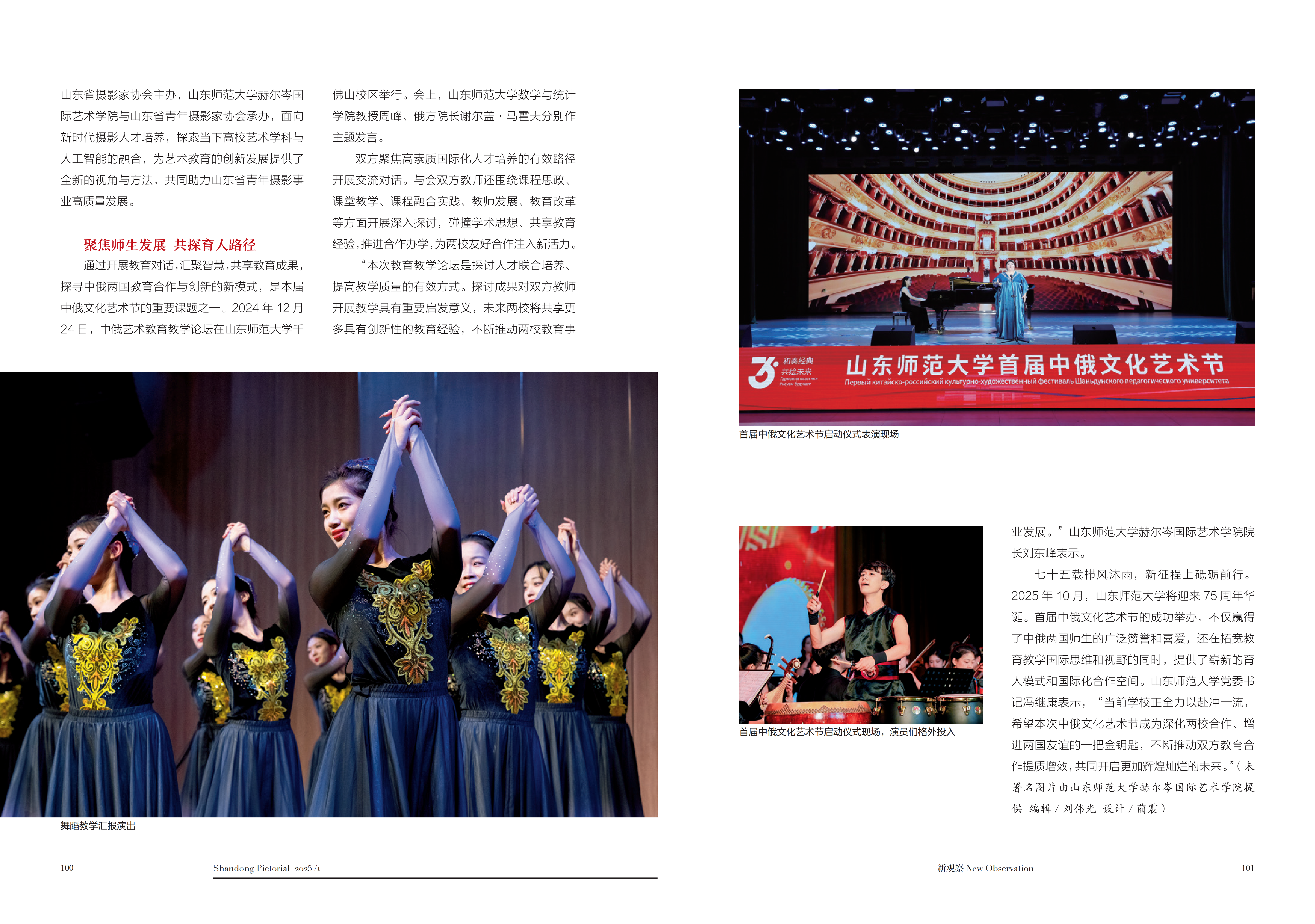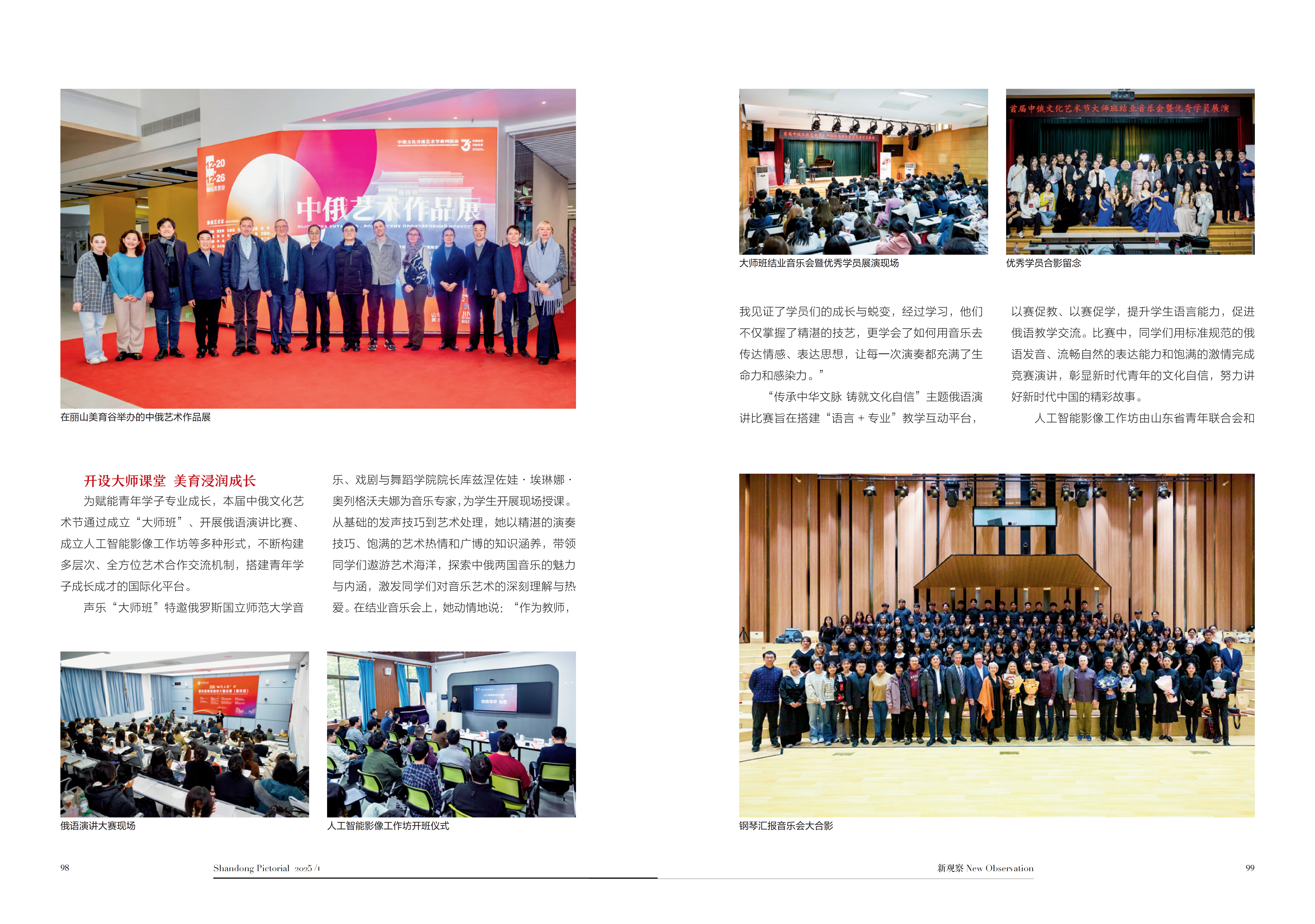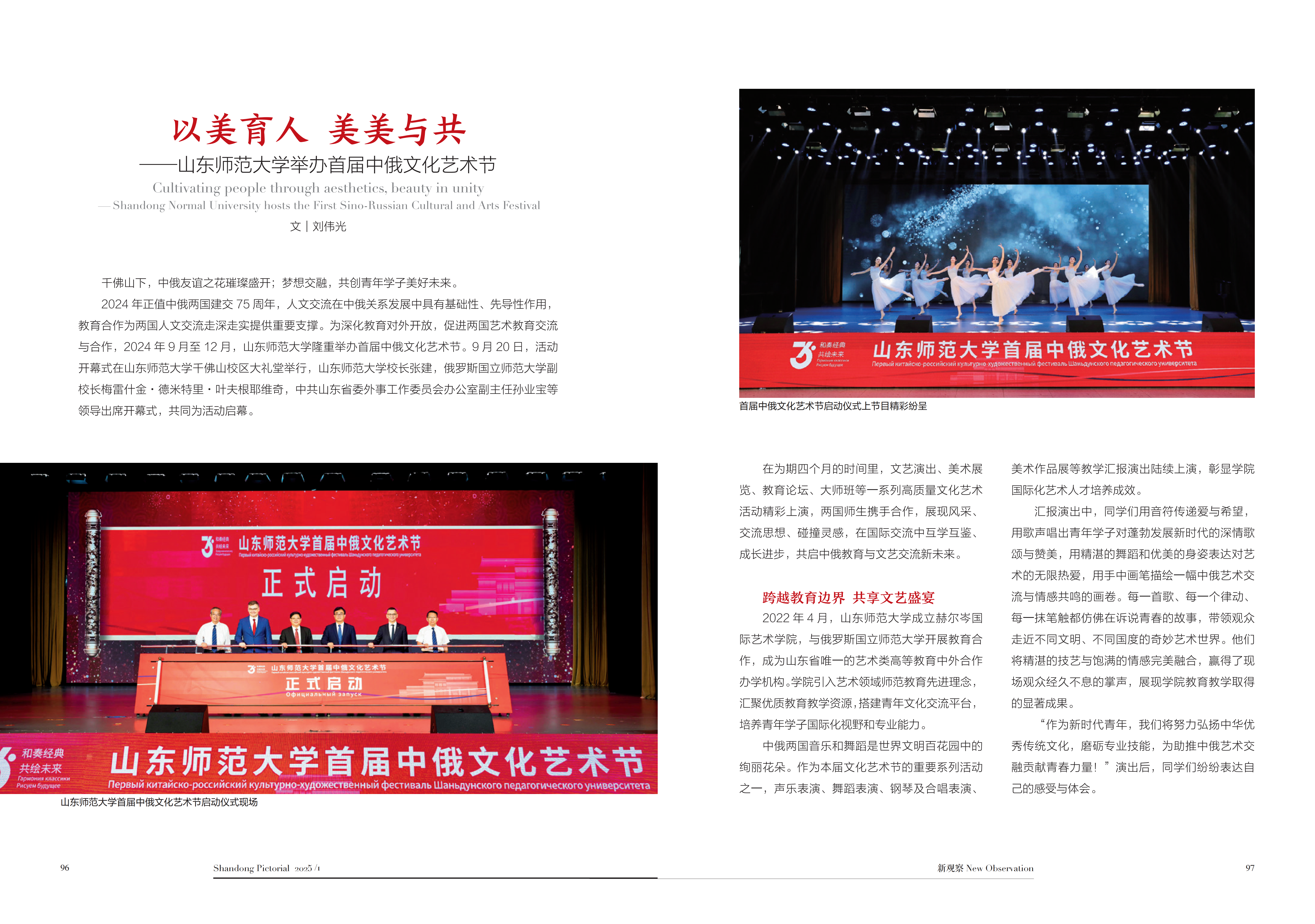 近日,“百强报刊”“山东省十佳期刊”《山东画报》2025年第一期两会专刊以《以美育人 美美与共——山东师范大学举办首届中俄文化艺术节》为题,从跨越教育边界·共享文艺盛宴、开设大师课堂·美育浸润成长、聚焦师生发展·共探育人路径三个方面对首届中俄文化艺术节举办情况进行了专题报道。