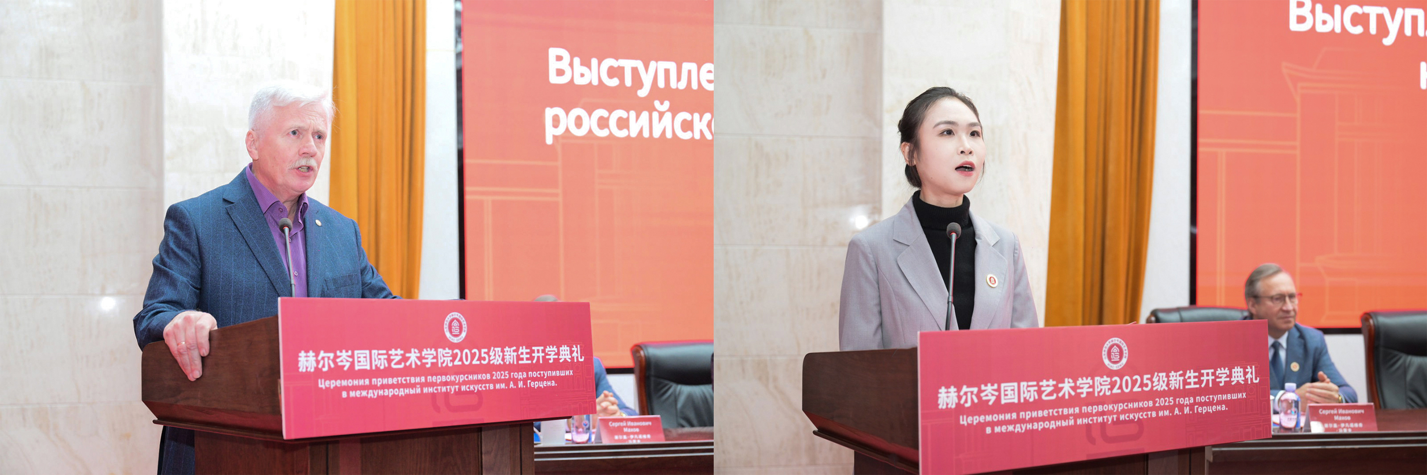 张建在致辞中对各位嘉宾的到来表示热烈欢迎,对新生致以最诚挚的祝贺和最美好的祝愿。他指出,赫尔岑国际艺术学院作为学校国际化办学的重要组成部分,在培养高水平国际化人才、推动教育综合改革、促进中外人文交流方面发挥着关键作用。过去三年,在中俄双方共同努力下,学院在国际化师资队伍建设、教育教学完善、中俄课程设置、教育教学质量等方面稳步提升,实践育人成果突出,开创了中俄教育文化合作新局面。他以树立国际视野、践行“美美与共”、秉承“博学笃行”三个关键词对新生及学院在未来的发展提出殷切希望,中俄两校将以更高的标准、更优的举措,为同学们搭建起一个兼具中国精神、国际视野和人文情怀的国内一流中外合作艺术教育人才培养平台。