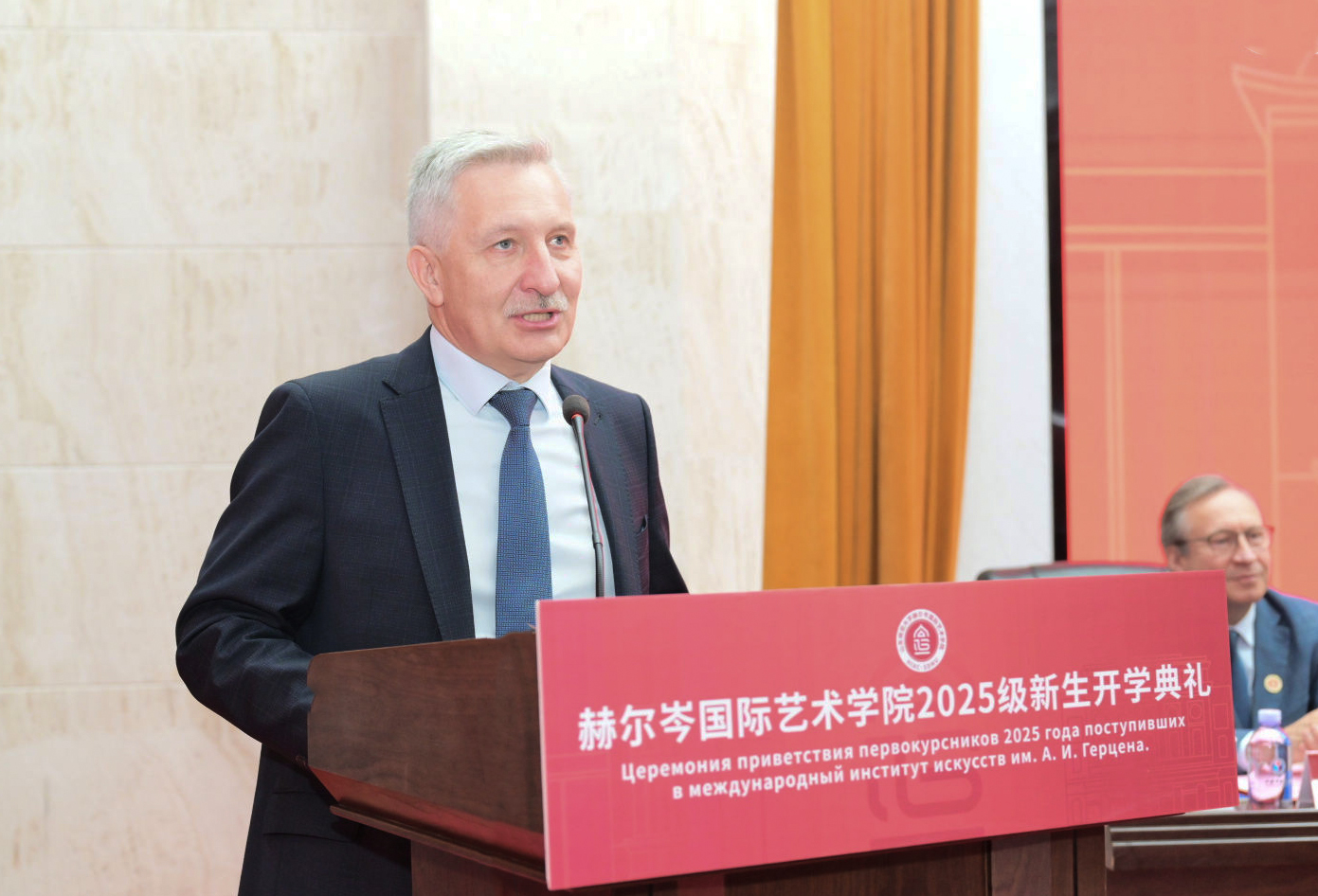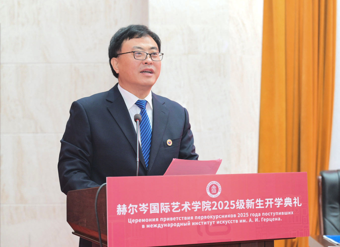 谢尔盖·瓦连京诺维奇·塔拉索夫在致辞中代表俄师大对全体新生的加入表示热烈的欢迎与诚挚的祝福。他强调,俄罗斯国立师范大学与山东师范大学紧密合作、蓬勃发展,两校共建的赫尔岑国际艺术学院是连接中俄的独特教育桥梁,自2022年招生以来已汇聚近千名优秀学子,学生成长的累累硕果正是中俄教育合作成效的最佳证明。他表示,此次访问期间,两校就校际互访、人才联合培养、教学科研合作等议题深入交流并达成诸多新共识,将为同学们搭建一系列优质国际教育资源平台,共同推动中俄艺术教育的融合与创新。最后,他鼓励同学们勇于探索未知,始终保持开放包容的态度,充分依托学院的发展平台,开阔视野,丰富学识,成为具有跨文化交流能力的艺术人才。