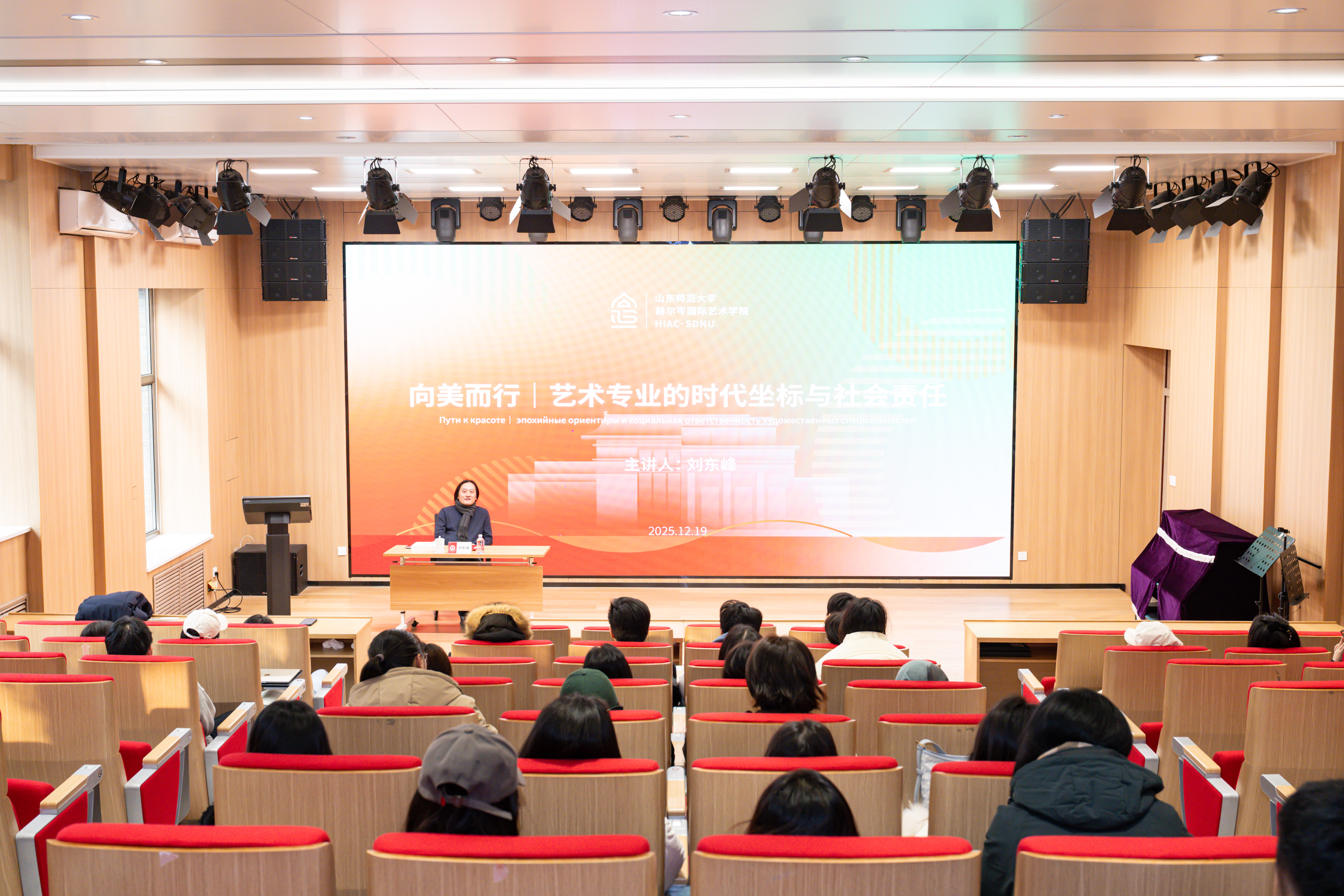 12月19日,赫尔岑国际艺术学院在教学一楼1313报告厅举办“向美而行——艺术专业的时代坐标与社会责任”主题思政课。本次课程由学院党委副书记、院长刘东峰主讲,2024级硕士研究生共同参与。课程围绕育人理念、学业发展与行业动向等核心议题进行了深入探讨。